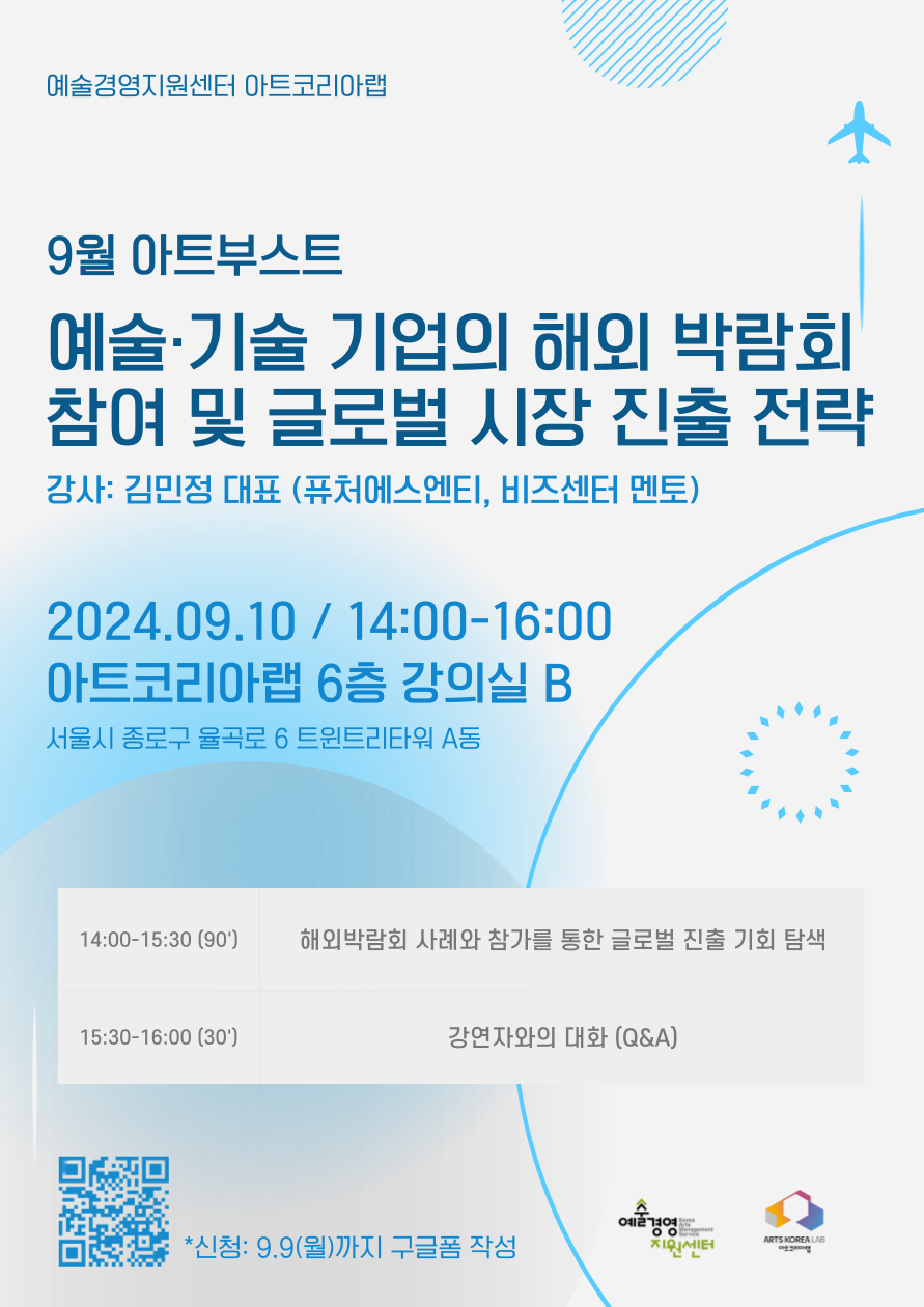 안녕하세요 아트코리아랩 운영사무국 씨엔티테크입니다. 아트코리아랩에서는 9월 아트부스트 프로그램 진행 예정입니다. 예술경영지원센터가 운영 중인 아트코리아랩에서는 예술 분야 예비 창업자 및 초기 창업기업들의 성장을 지원하며 예술산업 생태계 활성화에 기여하고자 합니다. 아트부스트는 예술 비즈니스 역량 강화를 위해 매월 진행되는 프로그램으로, 다채로운 주제의 교육과 멘토링을 제공합니다. [아트코리아랩 2024 아트부스트 9월 강연] ■ 운영 일시: 2024. 09. 10 (화) 14:00~16:00 ■ 운영 장소: 서울특별시 종로구 율곡로 6, 트윈트리타워A동 6층 강의실 B ■ 운영 대상: 해외 박람회 참여 예정이시거나, 글로벌 시장 진출 계획이 있는 예술·기술 예비 혹은 초기 창업가 (* 선착순 30인 진행으로, 사전 마감될 수 있음에 참고 부탁드립니다.) ■ 운영 내용 - 14:00 ~ 15:30: (강연) 해외박람회 사례와 참가를 통한 글로벌 진출 기회 탐색 - 15:30 ~ 16:00: (Q&A) 강연자와의 대화 ■ 강연자: 김민정 대표 (퓨처에스엔티, 비즈센터 멘토) ■ 모집 마감: 2024년 9월 9일(월) 16:00까지 ■ 신청 방법: 9월 아트부스트 신청 링크 혹은 아래 QR코드 신청 ※ 문의 사항 아트코리아랩 운영사무국 씨엔티테크 Tel : 02-708-2245 E-mail : artskorealab.cnt@gmail.com