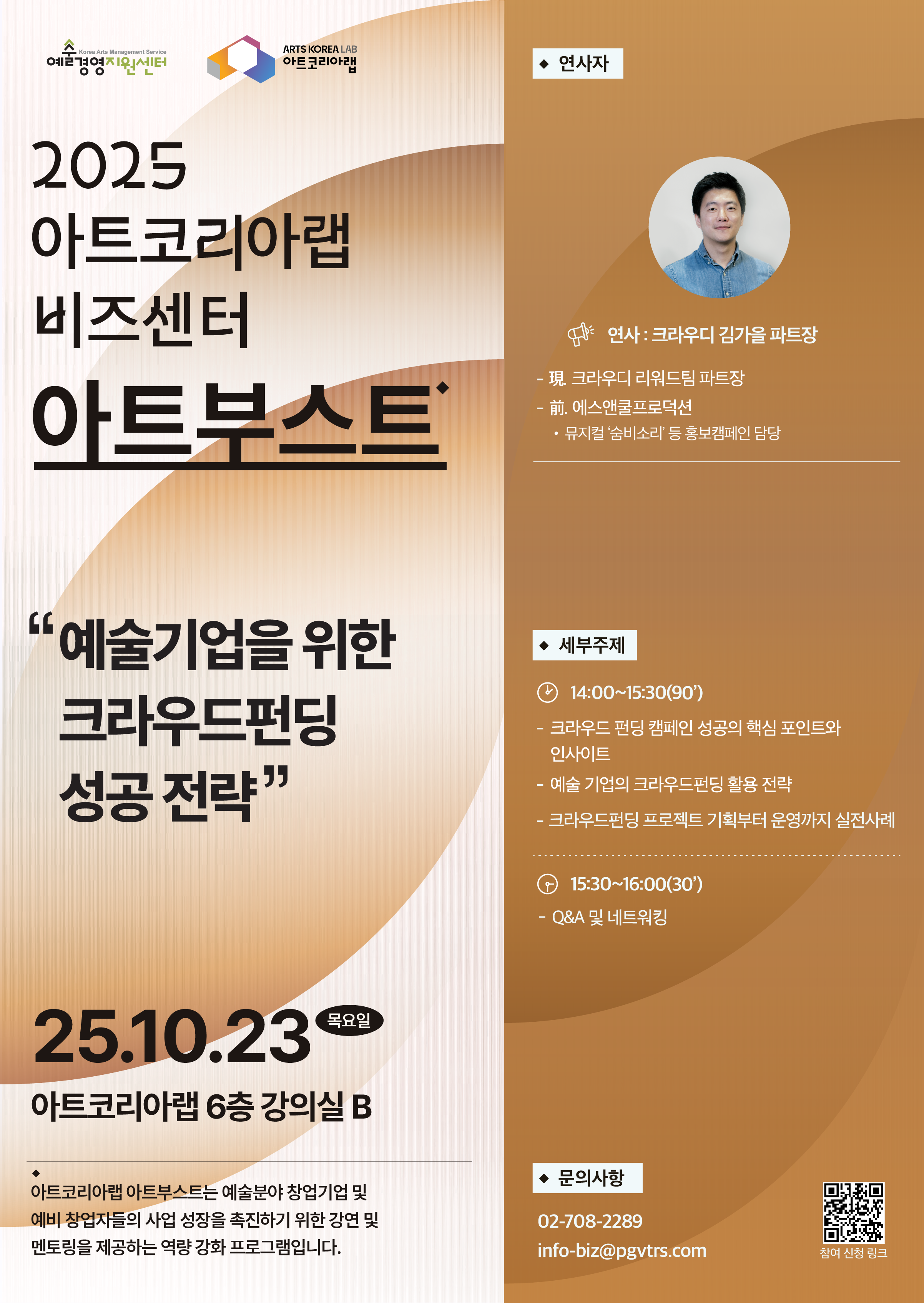 예술분야 창업기업 및 예비 창업들의 사업 성장을 촉진하기 위한 강연 및 멘토링을 제공하는 역량 강화 세미나입니다.